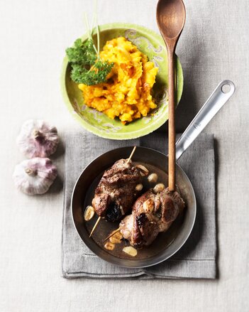 Auf dem Foto ist eine Pfanne mit zwei gerollten Schopfsteaks zu sehen. Dahinter steht eine Schüssel mit Püree. | © SONNENTOR