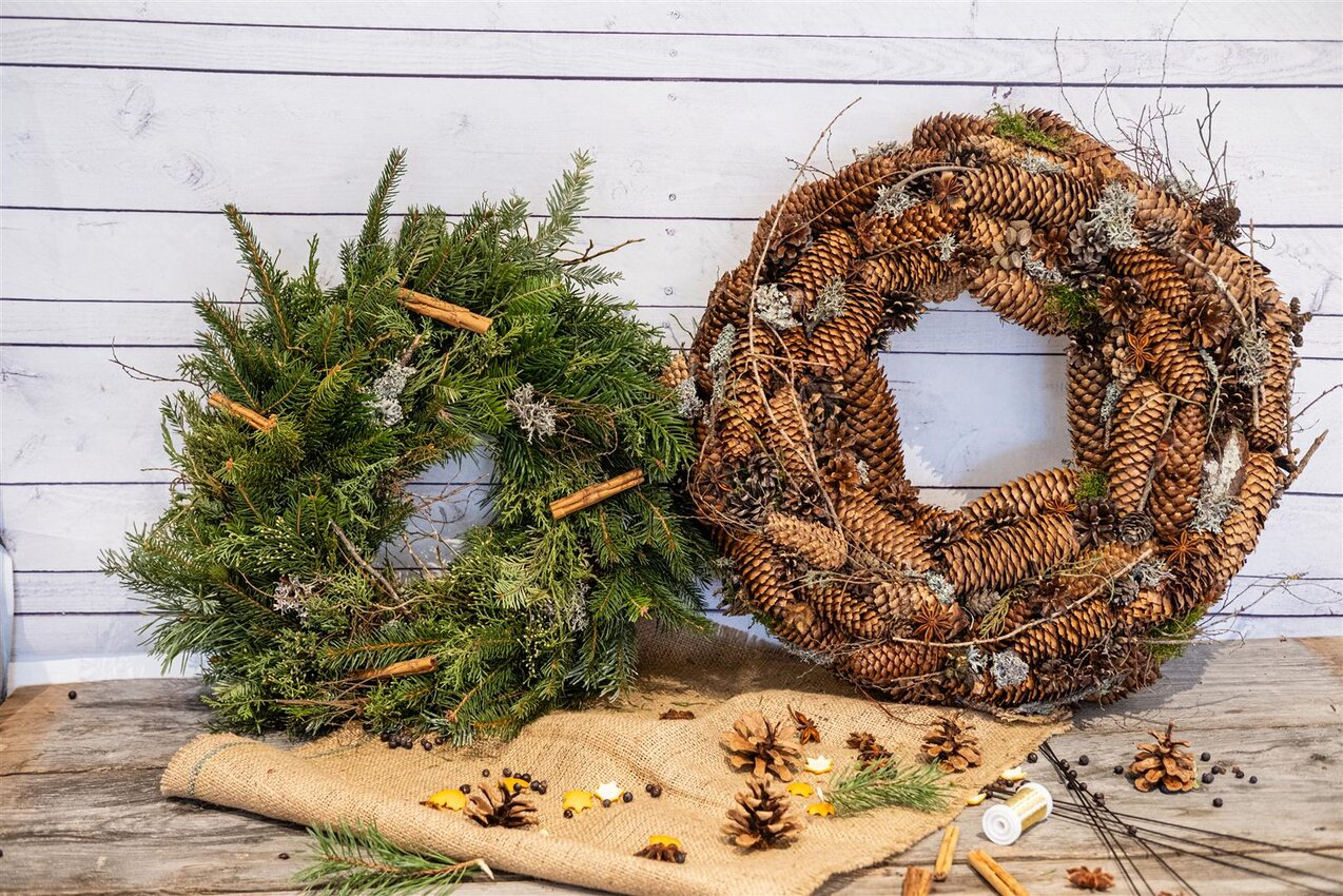 Gemeinsam arrangierst du duftende und strukturreiche Naturbestandteile wie verschiedene Reisigarten, Tannenzapfen, Zimtrinden, Sternanis, Orangenschalen und andere hübsche Fundstücke aus der Natur. Schritt für Schritt entsteht ein festliches Einzelstück, das deinem Zuhause Wärme, Duft und weihnachtlichen Glanz verleiht.