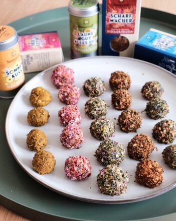 Die Bällchen in den verschiedenen Gewürzblüten wälzen. Fertig!